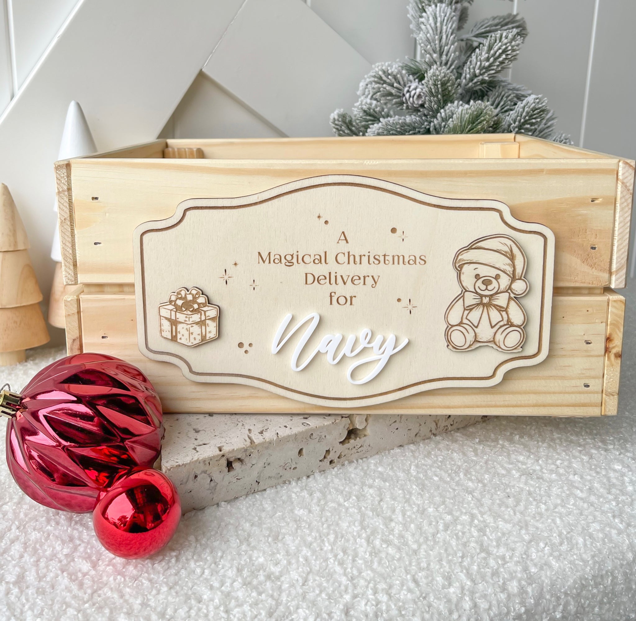 The newest addition to our Interchangeable Crate Plaques is our Vintage Teddy Bear Plaque. Engraved on quality wood with the sweetest Bear & Vintage Present picture.